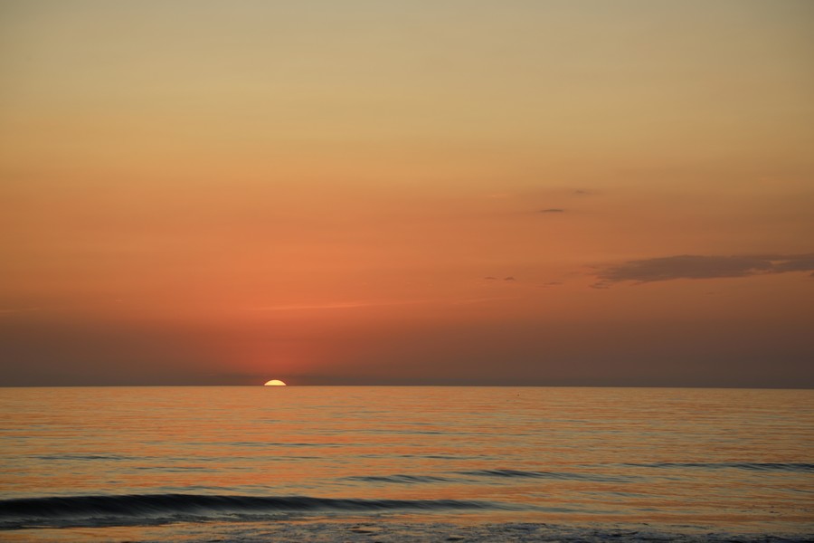 Il a fait encore chaud cette semaine. Hier soir, nous avons repris la direction de la plage, posé les vélos. Nous avons marché le long de la plage. L'air était lourd et moite. L'océan ressemblait à un lac. Le temps glissait lentement vers le large, le soleil est lentement passé de l'autre côté. Alors tout le monde est rentré....